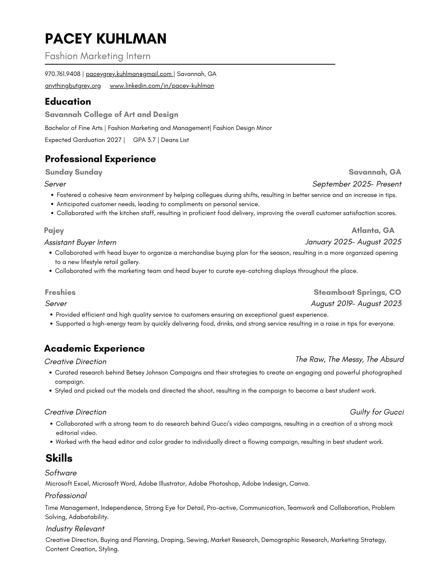 Driven by passion for storytelling through fashion, I am committed to transforming cultural trends into strategic narratives that turn into meaningful consumer experiences. My name is Pacey Kuhlman, and as a Fashion Marketing Major at the Savannah College of Art and Design (SCAD), I aim to bridge the gap between creative vision and success.